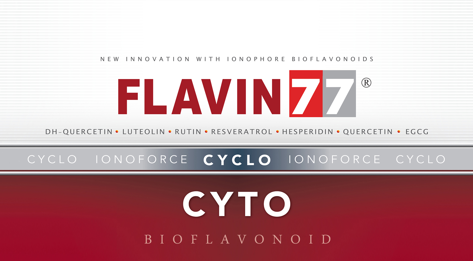 A FLAVIN 77 CYCLO a legnagyobb polifenol és flavonoid kapacitással és rendkívül magas hatóanyag-tartalommal rendelkezik. Az előkészítés során a növényi fitokemikáliák leghatékonyabb fajtái lettek kiválasztva és több éves kísérletezés eredményeként nanoméretűre őrölve. Így az emberi szervezet számára előnyös esszenciák felületi aktivitása egymilliószorosára nőhetett. Ennek köszönhetően a benne lévő anyagok (vitaminok, flavonoidok, aminosavak) felszívódása is nagymértékben megnőtt.